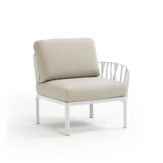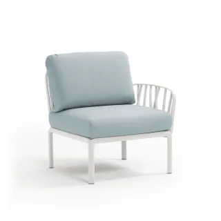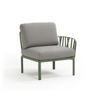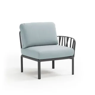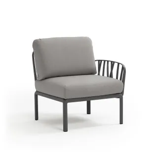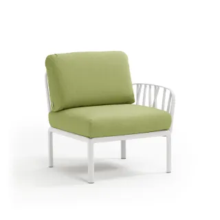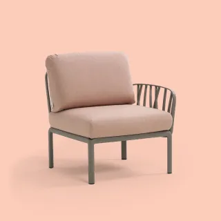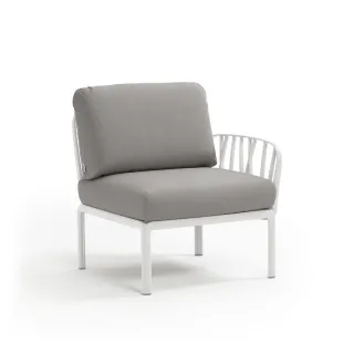 Sessel mit einer Armlehne (rechts oder links) aus glasfaserverstärktem Kunststoff und gepolsterter Sitzfläche und Rückenlehne, als Anfangs- oder Endkomponente in einer Komposition modularer Sitzgelegenheiten der Kollektion Komodo konfigurierbar.