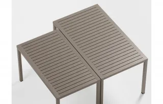 Stackable table 140X80 cm. Material: DurelTOP in polypropylene with UV additives and uniformly coloured. Legs in coated aluminum. Matt finish. Adjustable height feet. Recyclable resin.