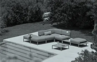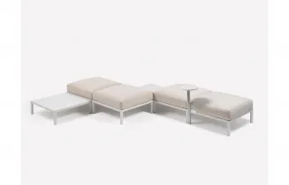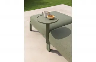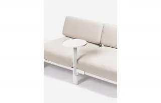 A functional low table in regenerated resin featuring a round top, and easily attachable to the Maximo system frame.