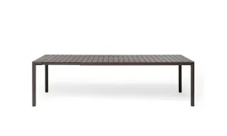 Table extensible. 211 - 275 x 100 x 76,5h cm. Matériau: plateau en polypropylène fiberglass traité anti-UV et coloré dans la masse. Structure en aluminium vernis. Effet mat. Résine recyclable. Vérins de réglage.