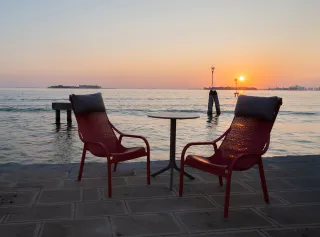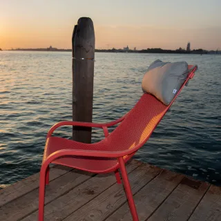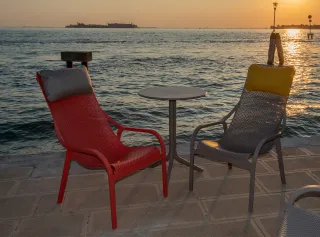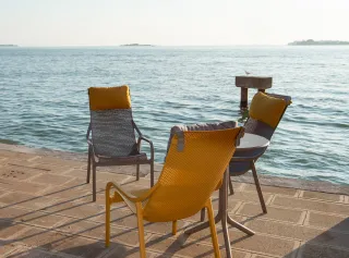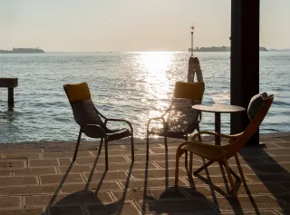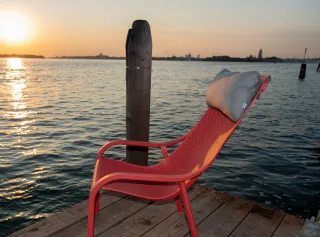 L’outdoor della nuova casa del cinema a Venezia sarà arredato con gruppi di poltrone relax dall’evocativo profilo a onda Net Lounge e tavolini Spritz.