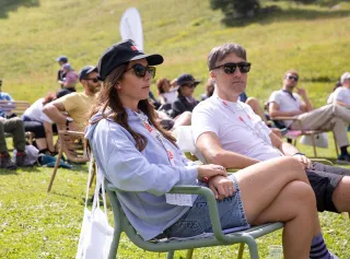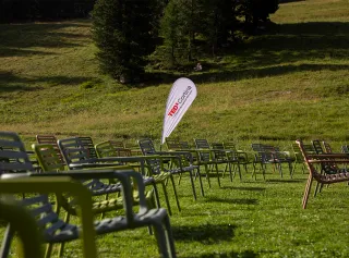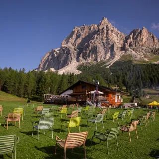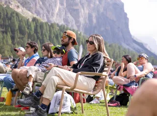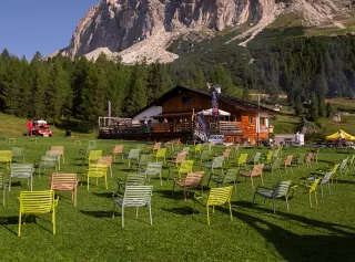Ad ospitare la platea di persone, le nostre poltroncine Doga Relax con il tavolino d’appoggio Doga Table, raffinati salottini open air immersi nello splendido scenario dolomitico di Cortina.