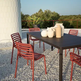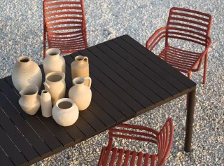 Eco-friendly per definizione, Tevere ha base in alluminio riciclabile abbinata al piano che è possibile scegliere in plastica rigenerata nel materico color Terra o in polipropilene vergine completamente riciclabile, nei colori antracite, tortora e nel nuovo corda.
