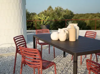 Design contemporaneo e anima green per il nostro tavolo allungabile da esterno con piano caratterizzato da un dinamico susseguirsi di doghe orizzontali.
