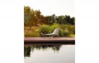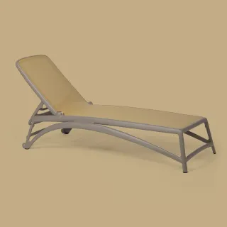 Forme ergonomiche che si adeguano in modo uniforme ed elastico allo scarico del peso e design filante per Atlantico, lettino prendisole con struttura in resina fiberglass e tessuto traspirante e ricambiabile. Schienale regolabile su quattro posizioni. Impilabile.