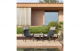 Poltrona lounge monoblocco. Materiale: polipropilene fiberglass trattato anti-UV e colorato in massa. Impilabile. Finitura opaca. Dotata di piedini antiscivolo e mollette per fissare il telo mare. Cuscino disponibile su ordinazione. Resina riciclabile.