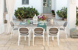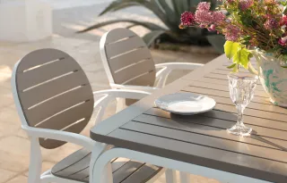 Sedia con braccioli. Materiale: polipropilene trattato anti-UV e colorato in massa. Finitura opaca. Dotata di piedini antiscivolo. Resina riciclabile.